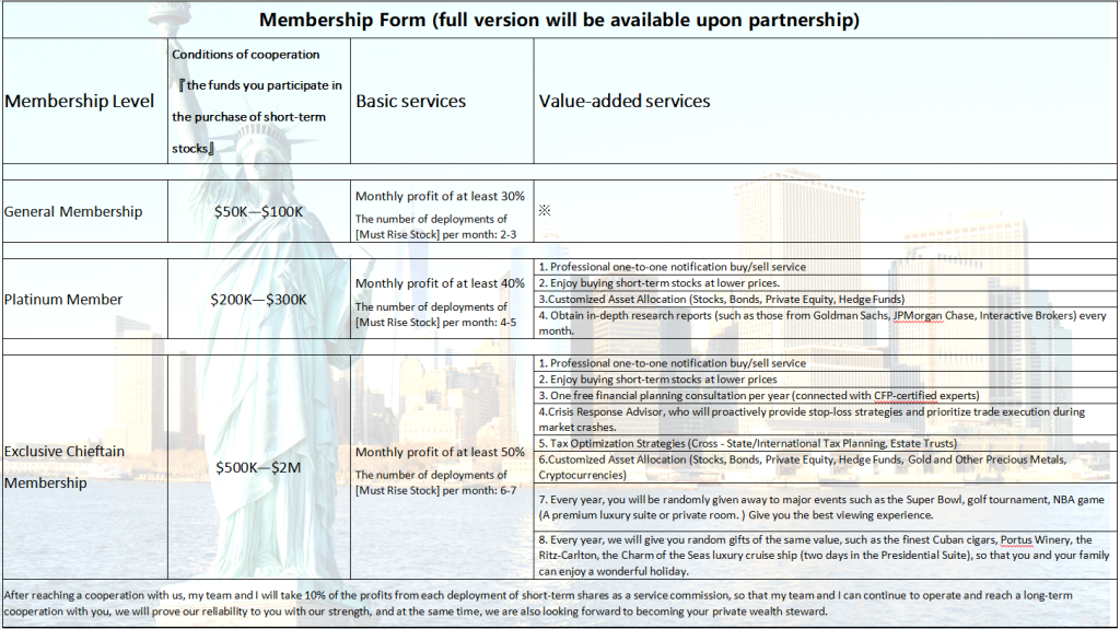 Funding requires $50 0,000 to $2 million. The basic service is profitable at least 50% a month and operates “Monthly Member Benefit Stock” 6-7 times a month. Value-added services are rich, in addition to the platinum member part services, and once a year free financial planning consulting, crisis response consultant, tax optimization strategy, more diversified custom asset allocation (including encryption currency, etc.), each year will be random super bowl, golf tournament, NBA game qualification, and high-grade Cuban cigar, luxury winery experience, luxury cruise and other random equivalent gifts. Each service is carefully designed and strictly implemented. In addition, the high-end event viewing opportunities and luxury gifts for members are not only a demonstration of the noble status of members, but also a sincere feedback to our long-term support of investors.