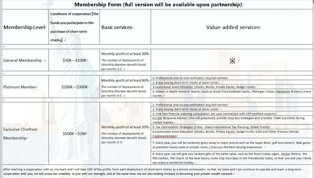 Funding requires US $20 0,000-US $30 0,000. Basic services shall make at least 40% profit per month and operate “must rise stocks” 4-5 times a month. Value-added services include professional one-to-one trading notifications, short-term stock purchases at low prices, customized asset allocation, and monthly in-depth research reports.