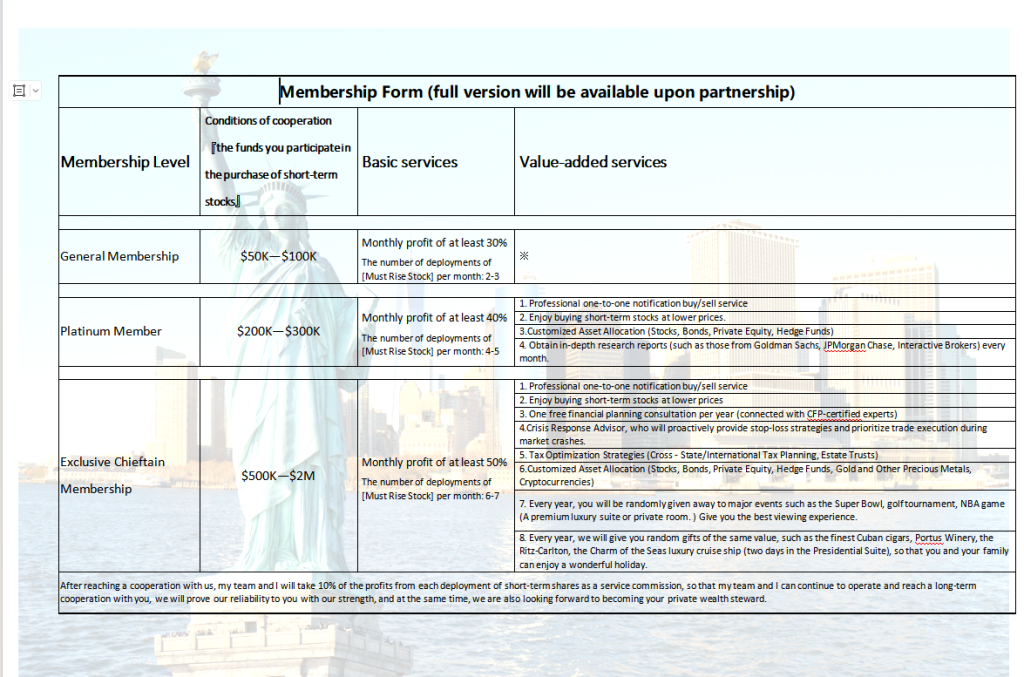 Become our full member, can enjoy the exclusive investment strategy, priority stock service, custom portfolio, get daily real-time market analysis, not regular offline communication meeting (can help members broaden the contacts), and we will use the 2 billion fund to help all full members to achieve profit maximization, according to the member level to achieve different monthly profit target, each member of the monthly profit is different, but become a full member of the minimum profit is not less than 30%.